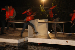 floating ping pong variiert inhaltliche und formale Aspekte der performativen Raumerkundung von 2006 in Korea. Die Aktion findet auf der Spree und damit auf unsicherem Grund statt. Hier lädt msk7 zum Ping-Pong-Spiel ein. Eine Tischtennisplatte steht zur Hälfte auf je einem Floß. Beide Flöße sind durch Seile miteinander verbunden. Die schmale Kluft zwischen den Flößen gilt es zu überspielen.